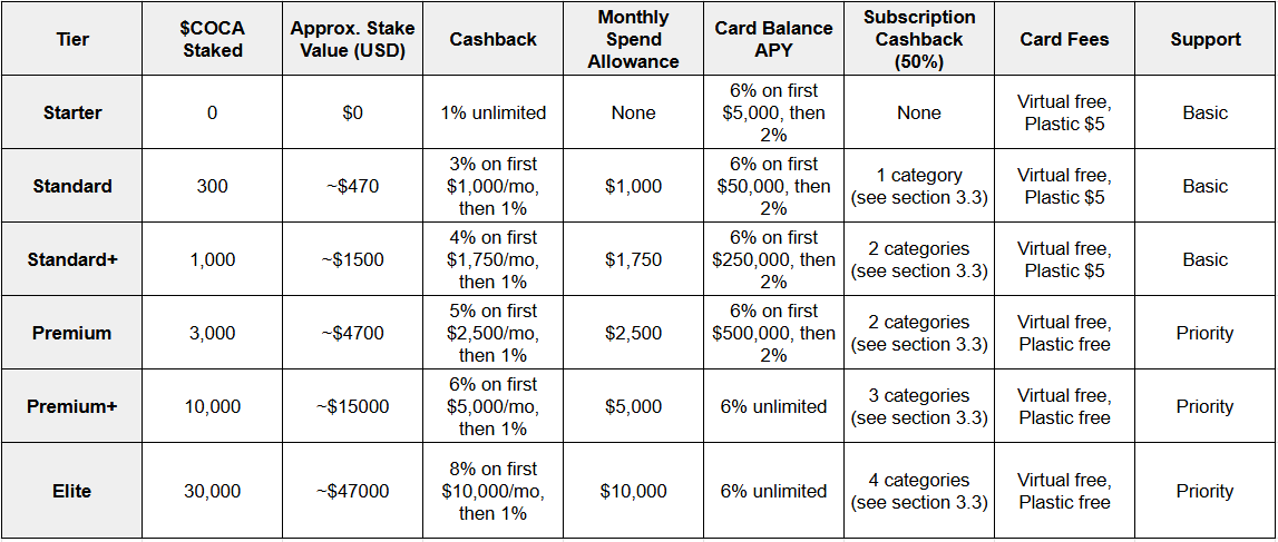 Vanaf September 2025 werkt staking anders. Je kan je COCA tokens enkel nog vastzetten om je niveau (tier) te verhogen voor je cashback en perks. Andere tokens zoals ETH end. werken zoals hierboven opgegeven.