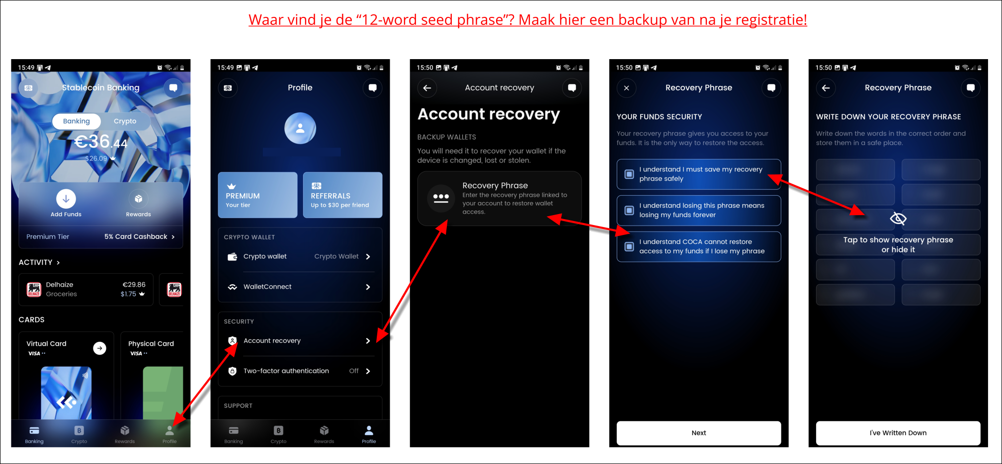 Na je inschrijving is het best dat je zo snel mogelijk je zogenaamde "Seed Phrase" opschrijft. Dit is een lijst van 12 woorden waarin je private keys zijn gecodeerd. Je moet deze ook opnieuw ingeven wanneer je op het login-scherm op "Sign out" klikt. Doe dit zo snel mogelijk want dit is je enige toegang (opnieuw) tot je wallet en je kaart! Hier zie je waar deze 12 woorden zitten.