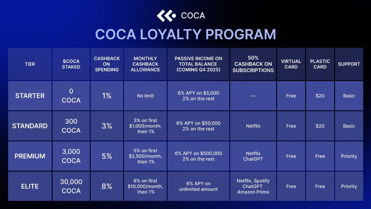 Vanaf 1 September wordt het huidige cashbacksysteem aangepast naar een systeem met niveaus (tiers). Vergelijkbaar met Crypto.com of Nexo tiers. Hierbij moet je een aantal COCA-tokens kopen en vastzetten in Staking. Er zijn 4 niveaus. Starter (0 COCA), Standard (300 COCA), Premium (3000 COCA) & Elite (30000 COCA). Hier de tabel met welke voordelen je hebt bij welk niveau. Opvallend is dat Apple Music wegvalt als abonnement waarop je 50% cashback op had.