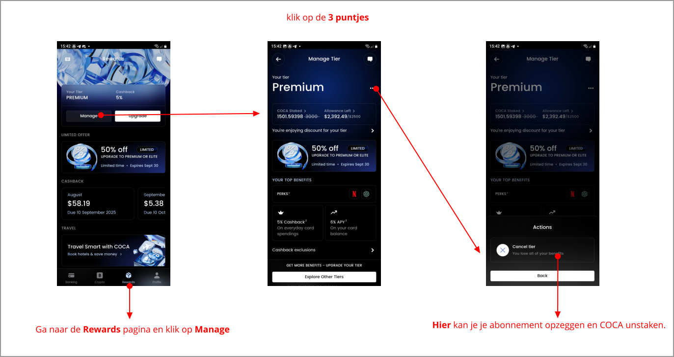 Vanaf September 2025 werkt staking anders. Je kan je COCA tokens enkel nog vastzetten om je niveau (tier) te verhogen voor je cashback en perks. Andere tokens zoals ETH end. werken zoals hierboven opgegeven.
